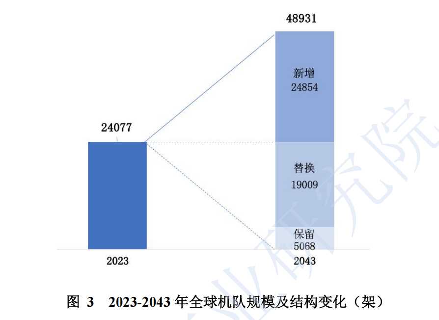 未来 20 年全球民航飞机市场将显著增长,客机新机价值达到 6.6万亿美元。根据中国商飞公司 2024 年 11 月发布的《市场预测年报(2024-2043)》,未来 20 年全球航空业将经历显著增长。预计全球旅客周转量(RPKs)将以每年 3.75%的速度增长,2043 年预计将达到 20.83 万亿客公里。与之相对应,全球客机机队规模也将显著扩大,预计将达到 48931 架,是 2023 年机队(24077 架)的 2 倍。未来 20年,现有机队中将有 78.9%(19009 架)的飞机退出商业客运服务,这部分客机将被新机替代;此外,市场还将需要 24854 架新增客机,合计需要 43863 架新机交付,价值约 6.6 万亿美元。其中,约 74.3%为单通道喷气客机。