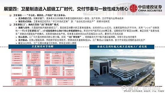 4.卫星制造迈入“超级工厂”时代:竞争焦点转向批量生产的效率与一致性。以海南文昌卫星超级工厂为代表,采用自动化脉动生产线,目标年产能可达千颗,实现“出厂即发射”,推动制造范式革命。