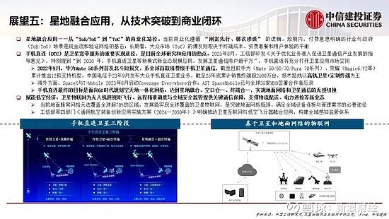 5.星地融合应用探索商业闭环:商业化遵循“刚需先行”路径,从ToB/ToG向ToC市场渗透。手机直连卫星(DTC)成为热点,工信部设定了到2030年用户超千万的发展目标,为6G空天地一体化网络奠基。