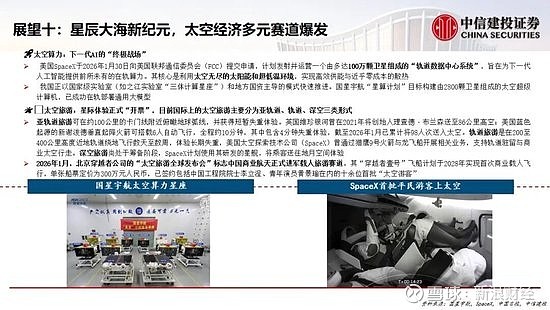 10.太空经济开启多元赛道爆发:产业边界极大拓展,前沿领域包括:太空算力(如轨道数据中心)、太空旅游(亚轨道、轨道及深空旅行)、重型运载器研发以及火星移民等长远愿景,迈向真正的“星辰大海”新纪元。