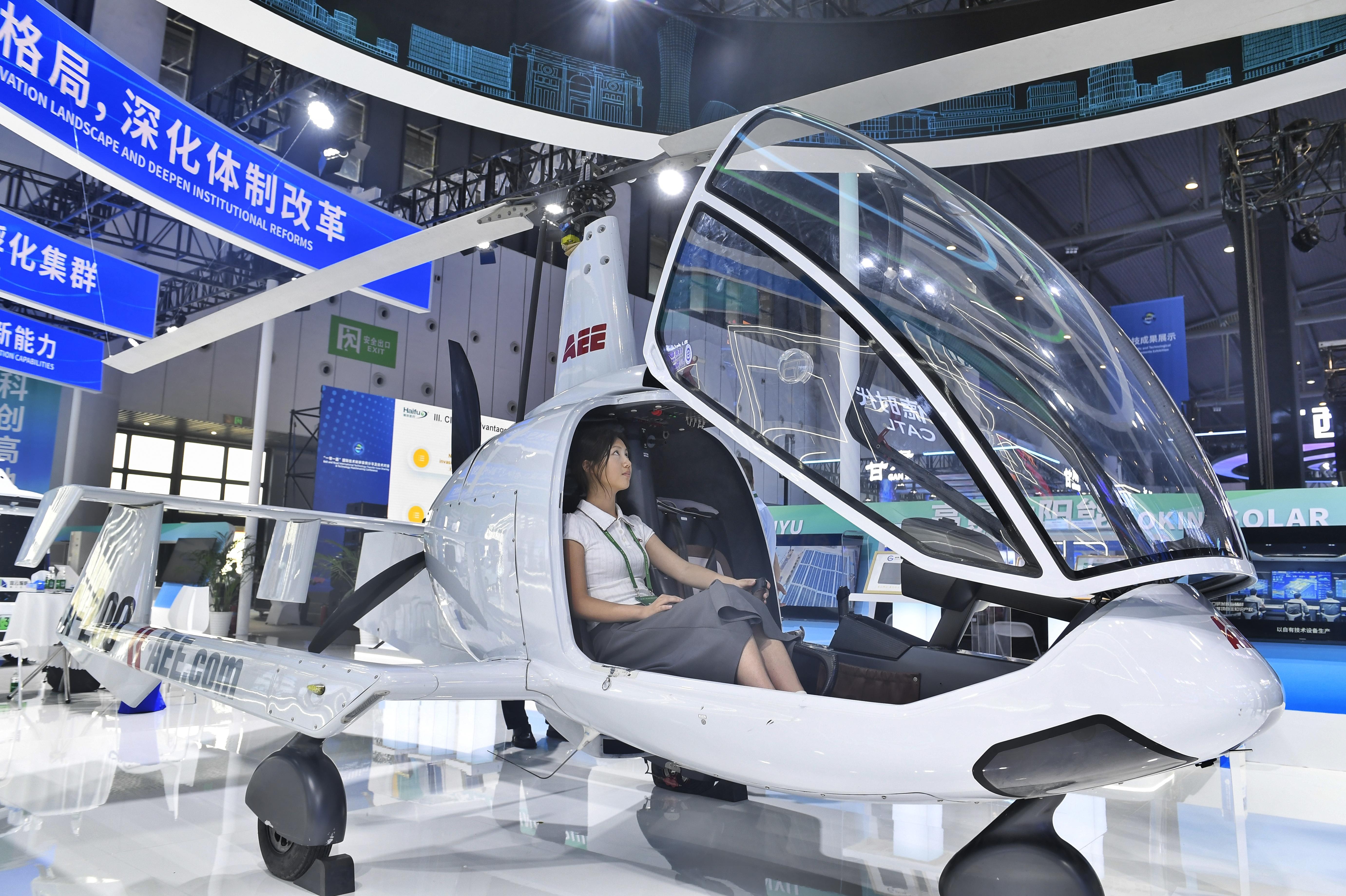 6月11日,第二届“一带一路”科技交流大会在四川成都开幕。图为一名观众在体验展出的飞机。新华社记者 刘坤 摄
